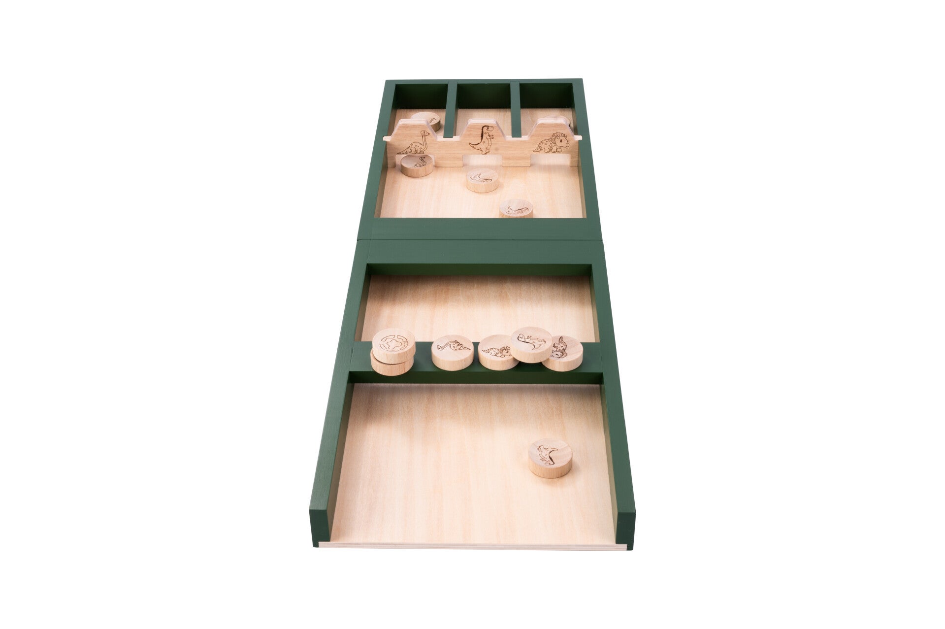 Deze sjoelbak is tweedelig en daarom makkelijk uit elkaar te halen en op te bergen in de katoenen opbergtas. De sjoelbak is speciaal ontworpen voor kinderen en heeft een dieren- of dino thema.